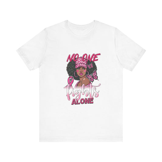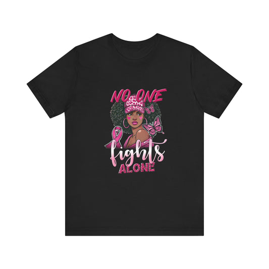 No One Fights Alone Breast Cancer Awareness Unisex Jersey Short Sleeve Tee Black Girl with Curly Hair