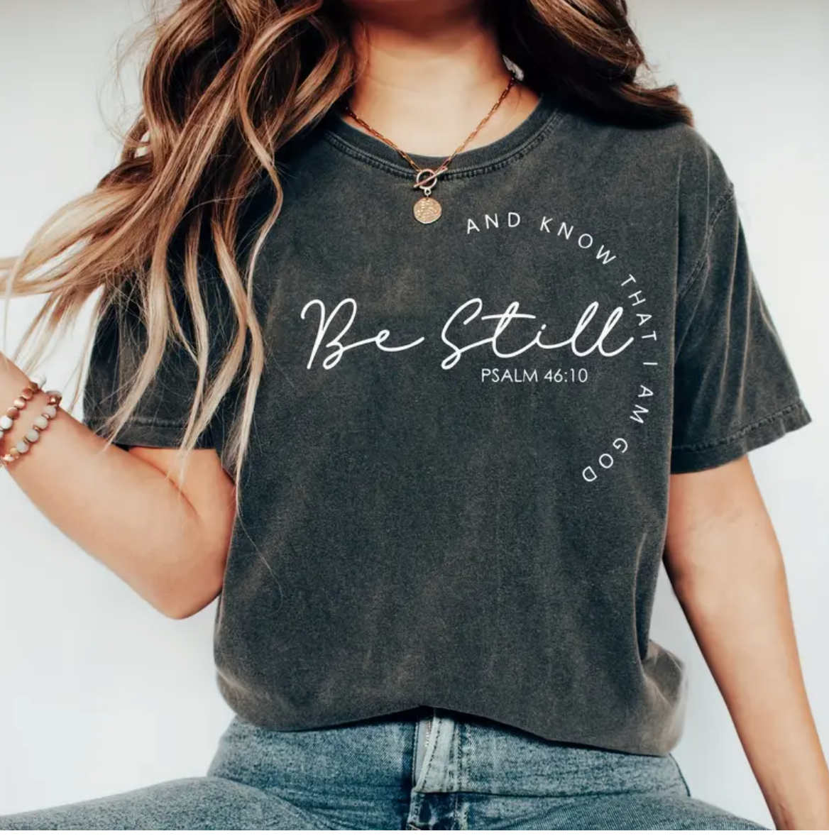 Let your faith speak through your style with this calming reminder from Psalm 46:10—“Be still and know.” This graphic tee is more than just a shirt; it’s a moment of peace in the chaos, a wearable declaration of trust and surrender.