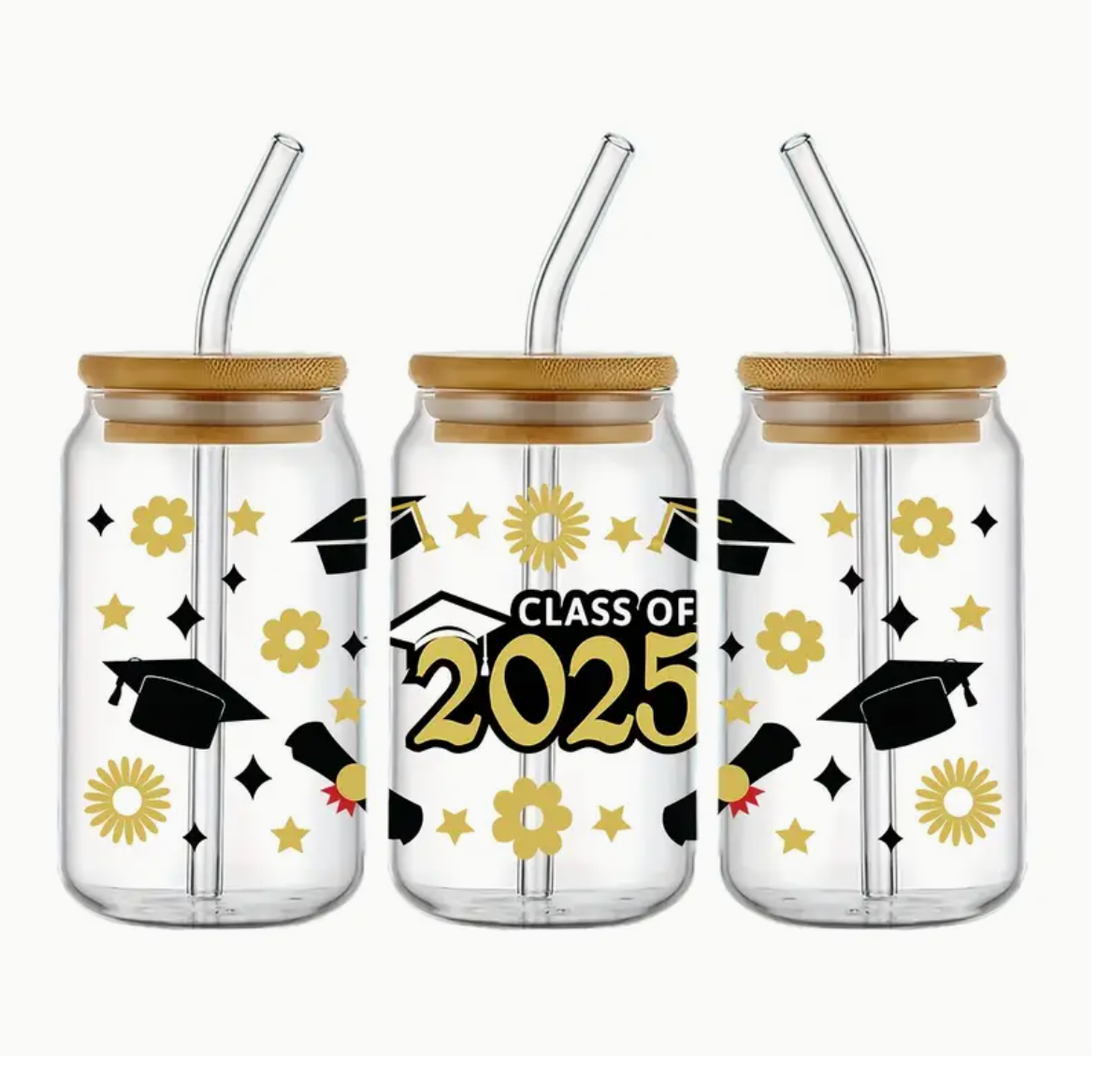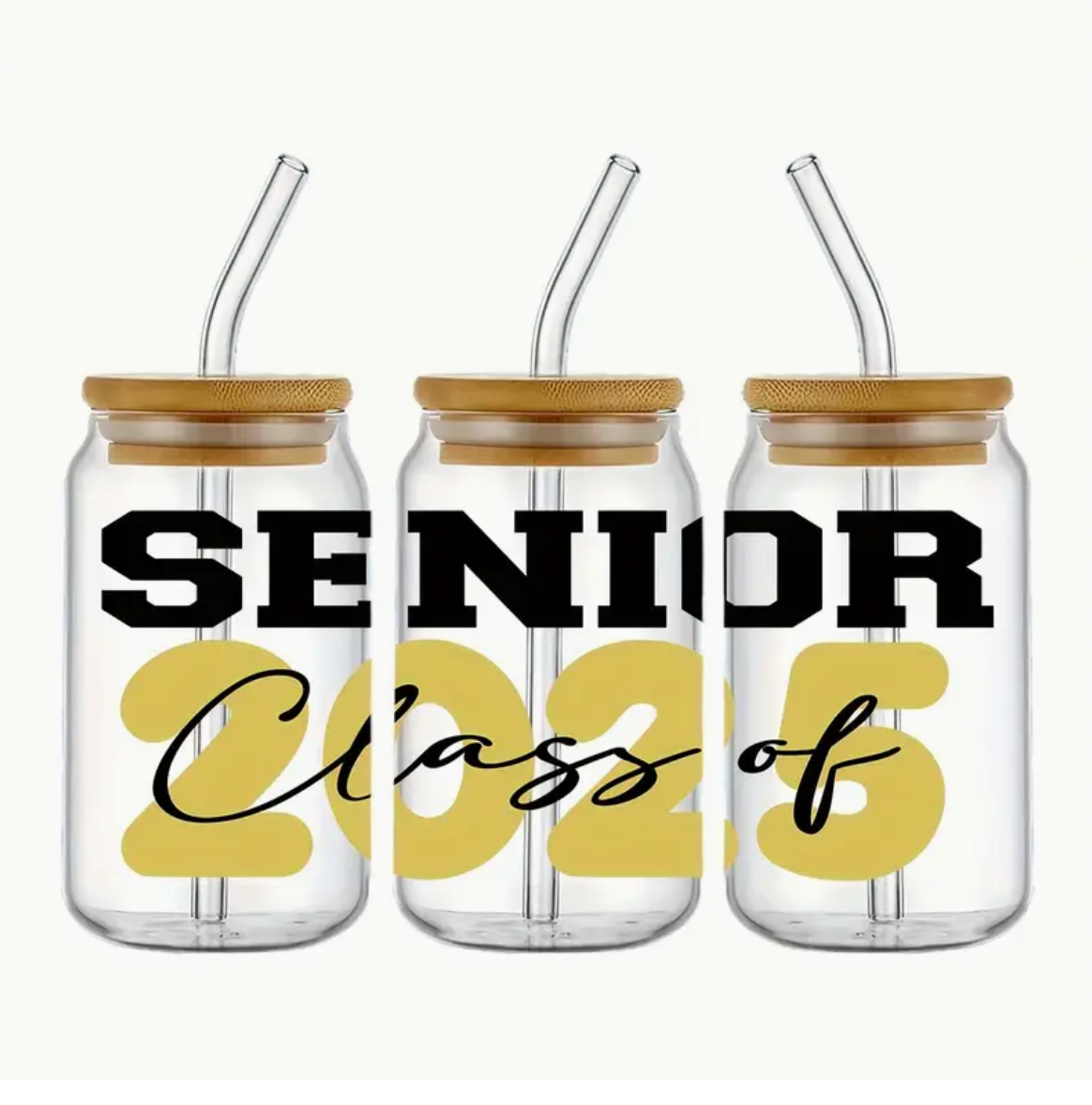 Celebrate your senior year every day with our Senior 2025 glass tumbler, designed for graduates who want to show off their class pride wherever they go. This stylish glass cup features a bold Senior 2025 design, perfect for morning coffees, iced lattes, or hydration on the go.