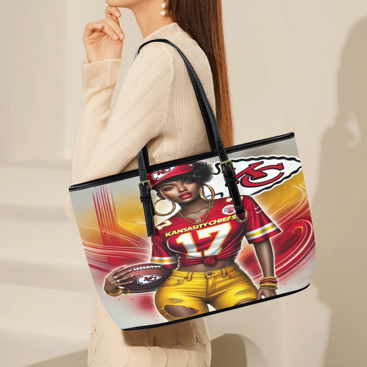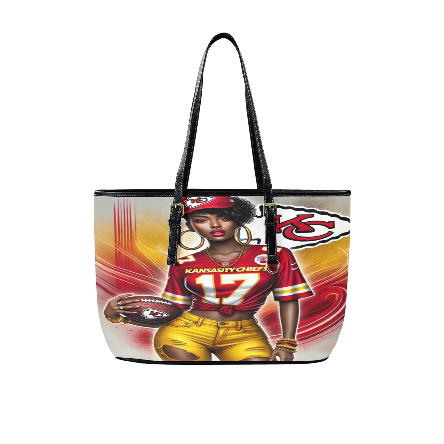 Get ready to show off your team pride with our Kansas City Chiefs tote bag! Perfect for everyday use, this large tote bag can fit all of your essentials. With themed images of the Chiefs, you'll represent your favorite team while staying organized and stylish. Order now and show your support for the Chiefs!