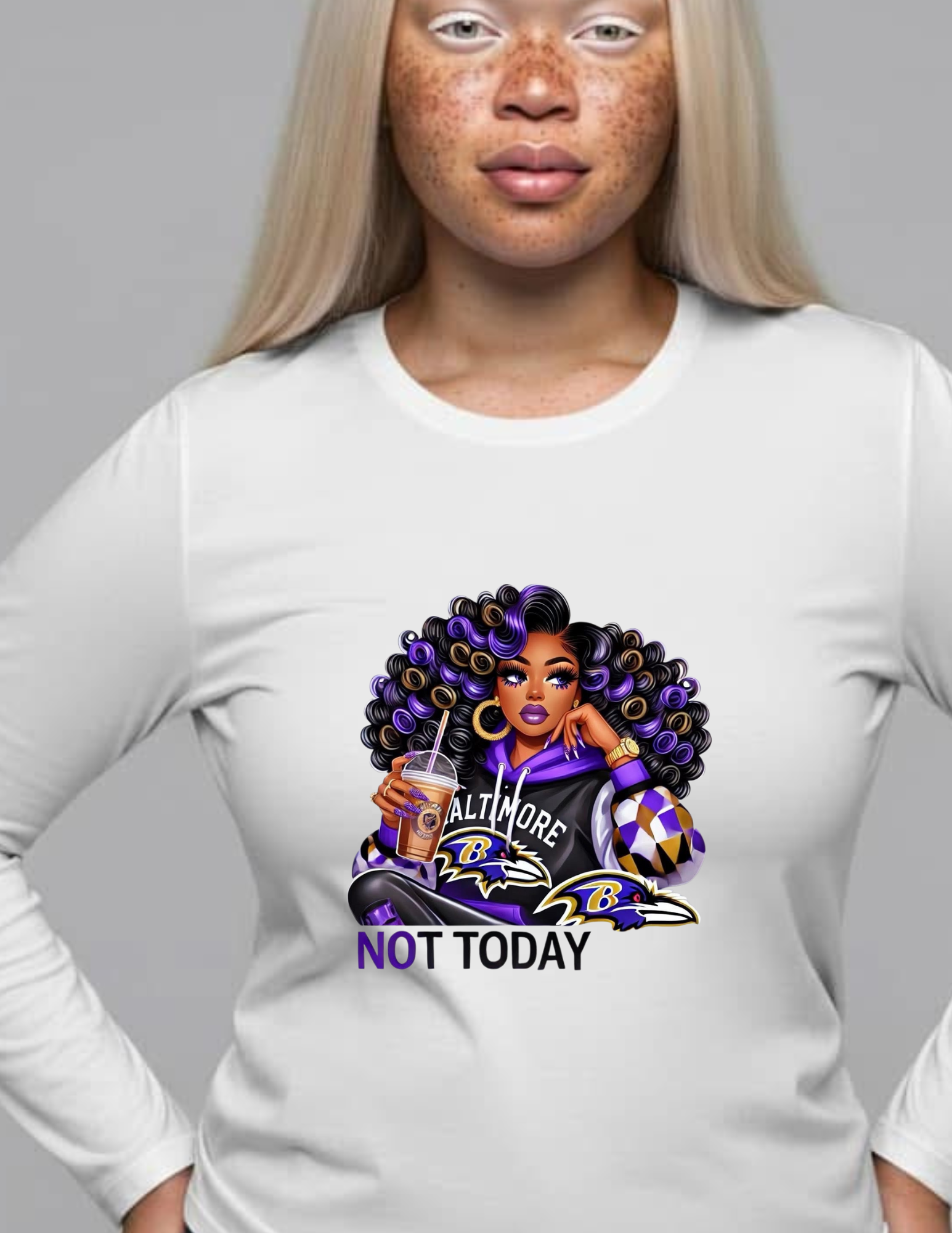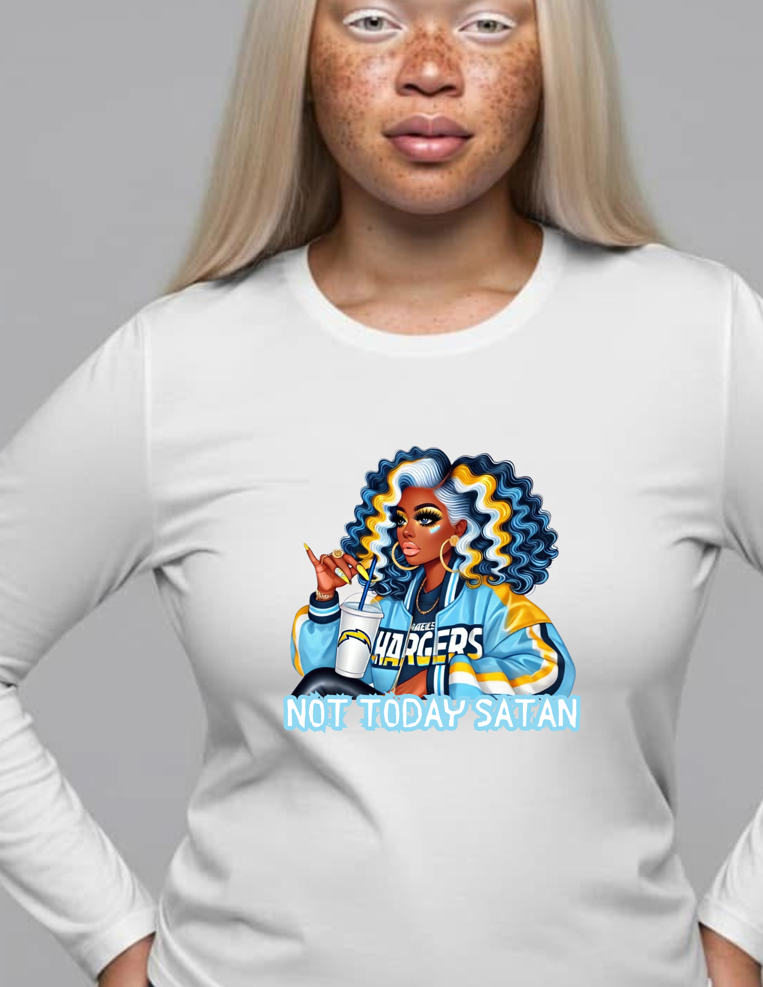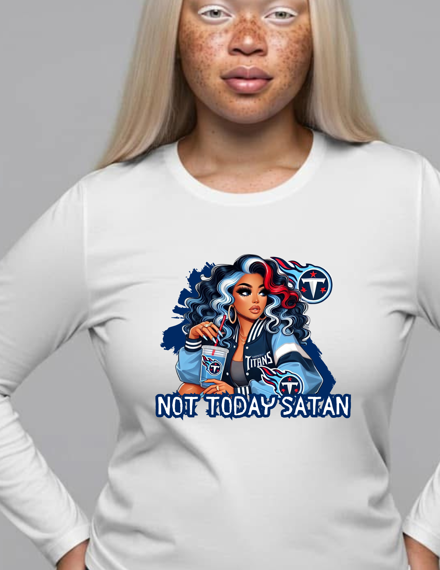 Faith meets football in this bold and sassy “Not Today Satan” graphic tee! Featuring a fierce, fashion-forward woman rocking her team pride with divine confidence, this shirt is the ultimate mashup of Sunday service and Sunday kickoff. Styled here in Tennessee Titans colors, the design includes team branding elements, sporty details, and a spiritual message that says, “I came to SLAY—not to play.”