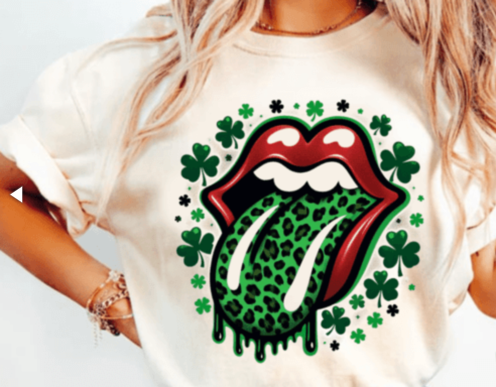 Rock your wild, lucky side with our Lucky Lips Tee, a bold twist on the classic rock 'n' roll vibe! Featuring an open mouth with fierce red lipstick, a green leopard-print tongue, and scattered shamrocks, this tee is all about luck, attitude, and a little bit of edge. Whether you’re celebrating St. Patrick’s Day or just love a statement look, this shirt is a must-have!
