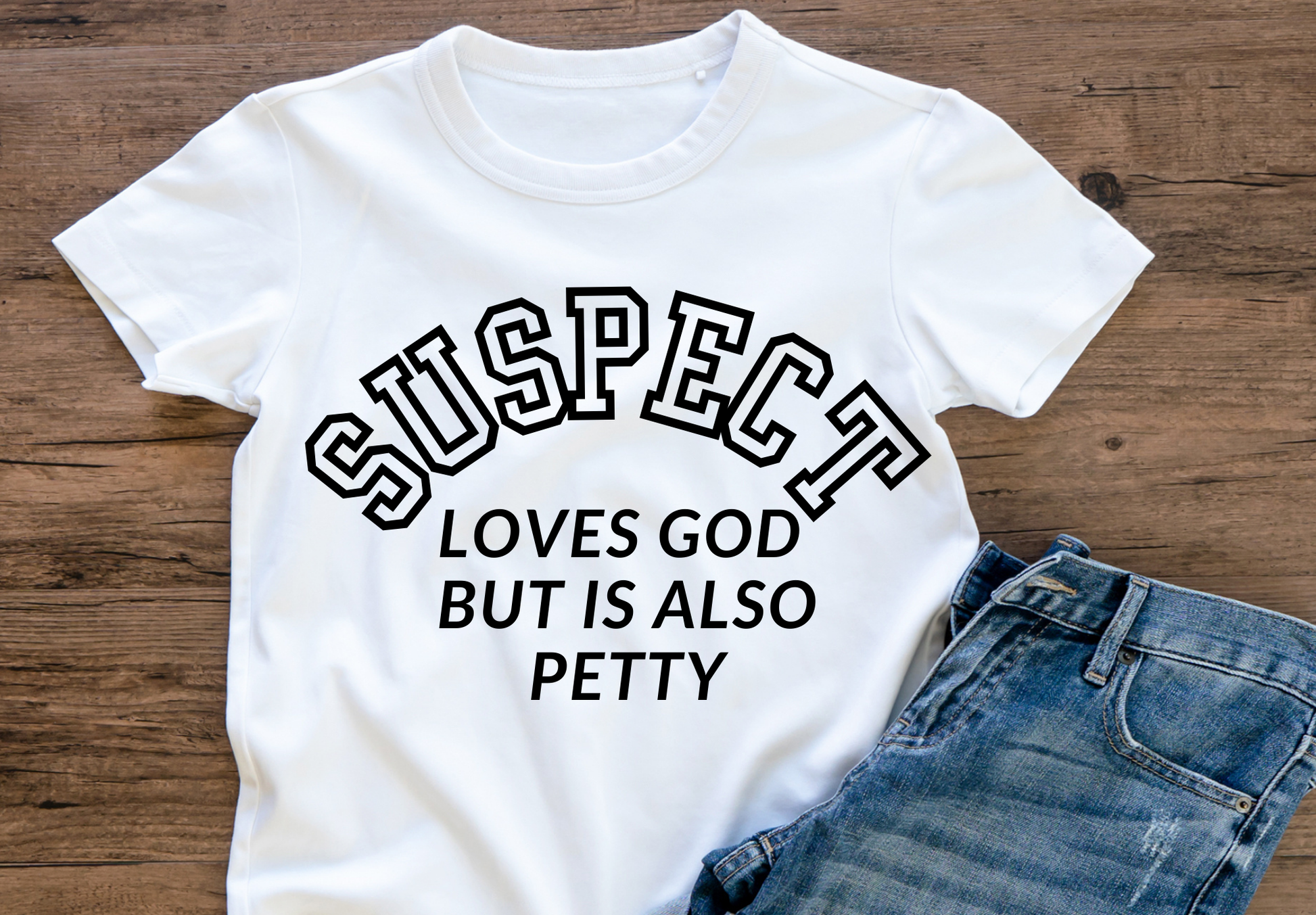 "Suspect Loves God but is Also Petty" T-Shirt – Faith with a Side of Sass!